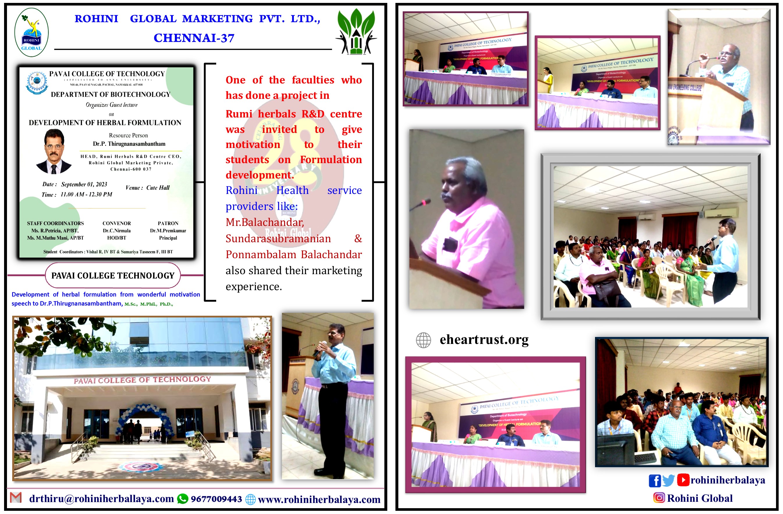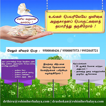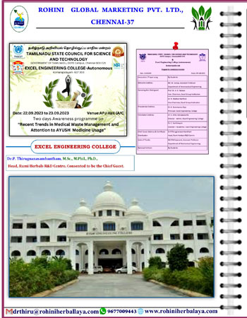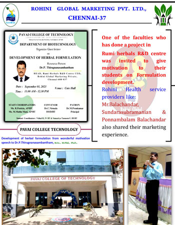 Dr. P. Thirugnanasambantham HEAD, Rumi Herbals R&D Centre CEO, Rohini Global Marketing Private Limited Mobile: +9195000 29890 Phone +9144 –40194570 E-mail: thiru.herbs@gmail.com Skype: rohiniglobal 327,IV Cross street,MohanRam Nagar, Mogappair,Chennai-600 037.