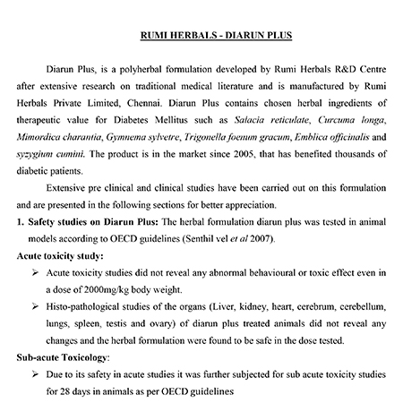 Rumi Herbals' Diarun Plus - a Polyherbal capsule is an exclusive formulation developed and tested for its anti-diabetic activity. The study shows that it could be taken as a DIETARY SUPPLEMENT along with Modern Medicine. Besides reducing blood sugar level, Rumi Diarun plus also has other benefical effects for diabetics. Click here to read the studies made on Rumi Herbals' Diarun Plus.